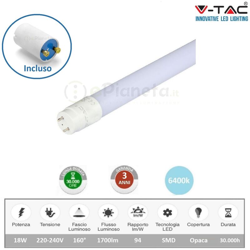 Tubo LED T8 in Nano Plastic con potenza di 18W e attacco G13. Lunghezza 120 cm con copertura in opaca. Rapporto fino a 94 lm/W. Questo tubo LED si contraddistingue per il materiale Nano Plastic, che è più leggero, migliora la resa luminosa e lascia inalterate le caratteristiche dissipative. Il tubo LED viene fornito con uno Starter da sostituire a quello presente nella plafoniera. Caratteristiche tecniche Potenza 18W Potenza equivalente 36W Flusso luminoso 1700lm Fascio luminoso 160° Tensione 220-240V Tecnologia led SMD Attacco GU10 Luce disponibile 6400k-4000K-3000k Vita media 30000h Copertura Opaca Dimensioni Altezza 1200 mm Diametro 27,9 mm Compatibilità: i tubi LED sono costruiti con le stesse dimensioni ed attacchi dei tubi fluorescenti T8 standard. Alcune plafoniere potrebbero richiedere modifiche in quanto, oltre alla sostituzione del tubo classico e dello starter, si deve eliminare anche il ballast elettronico interno, altrimenti la sua elettronica potrebbe interferire con