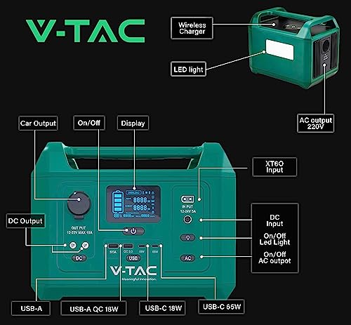 POWER STATION V-TAC: Centrale Elettrica Portatile 288Wh di ultima generazione con potenza massima 600W - AC:220V, dotata di prese elettriche, prese USB, ricaricabile con presa di corrente oppure pannello solare fotovoltaico (opzionale).