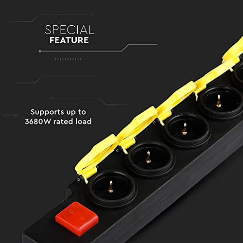 MULTIPRESA V-TAC: Ciabatta Multipresa Impermeabile in Gomma con 5 Prese 10A/16A Schuko con Cavo da 3 metri e Spina 16A. Dotata di 5 coperchi indipendenti in gomma e interruttore centrale per spegnerla e accenderla.