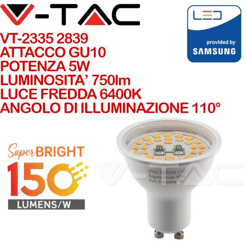 Lampada Faretto Led Attacco GU10 Modello 160 Lumens/W, 5W=55W Massimo Risparmio 220V 5W 800 Lumens, Bianco Freddo 6400K Diffusore Trasparente, Angolo Largo 110 Gradi Diametro 50mm Altezza 58mm Marca V-TAC SKU GU10805F Dimmerabile NO Voltaggio AC220-240V 50/60Hz Potenza 5W Luminosità 800 Lumen CRI RA>80 Angolo Luce 110 Gradi Diffusore Trasparente Colore Bianco Freddo Circa 6400K Impermeabilità IP20 Temperatura Emesso < 50°C Misura(mm) Diametro 50mm, Altezza Totale 58mm Durata 20000 ore Omologazione SI, CE e RoHS Nota Bene Modello 160LM/W, Massimo Risparmio
