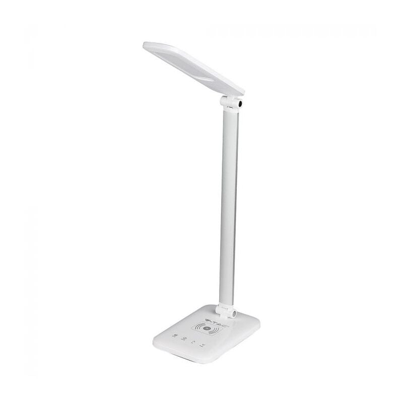 Lampada da tavolo LED V-TAC multifunzione, realizzata in ABS e alluminio dal design moderno ed elegante, adatta per essere appoggiata su qualsiasi tipo di superficie piana. La lampada ha una potenza di 7W, con un'intensit luminista di 400lm e apertura fascio di 120. La lampada presenta un'asta inclinabile fino a 90 e una testa rotante fino a 270, questo consente di direzionare il fascio luminoso a proprio piacimento. La lampada dispone di base ricarica wireless etasti a sfioramento (touch). Grazie alla base di ricarica wireless sar possibile ricaricare il proprio smartphone, semplicemente posizionando il dispositivo sull'icona di ricarica, presente sulla base di accensione della lampada. Sulla base sono presenti molteplici tasti di funzione che consentono di programmare e regolare vari parametri di colorazione e intensit della luce, garantendo la giusta tonalit e quantit di luce che serve con un semplice tocco. E' possibile scegliere il grado di temperatura e colorazione della luce su