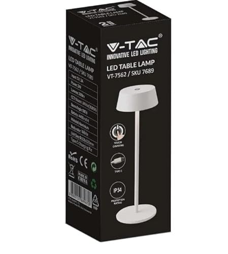V-TAC Lampada da Tavolo senza Fili LED Dimmerabile con Comandi Touch - Lampada Bianca Wireless per Uso Interno IP54 da Casa o Ristorante - Batteria 4400 mAh - Luce 3000K Bianca Calda - 2W