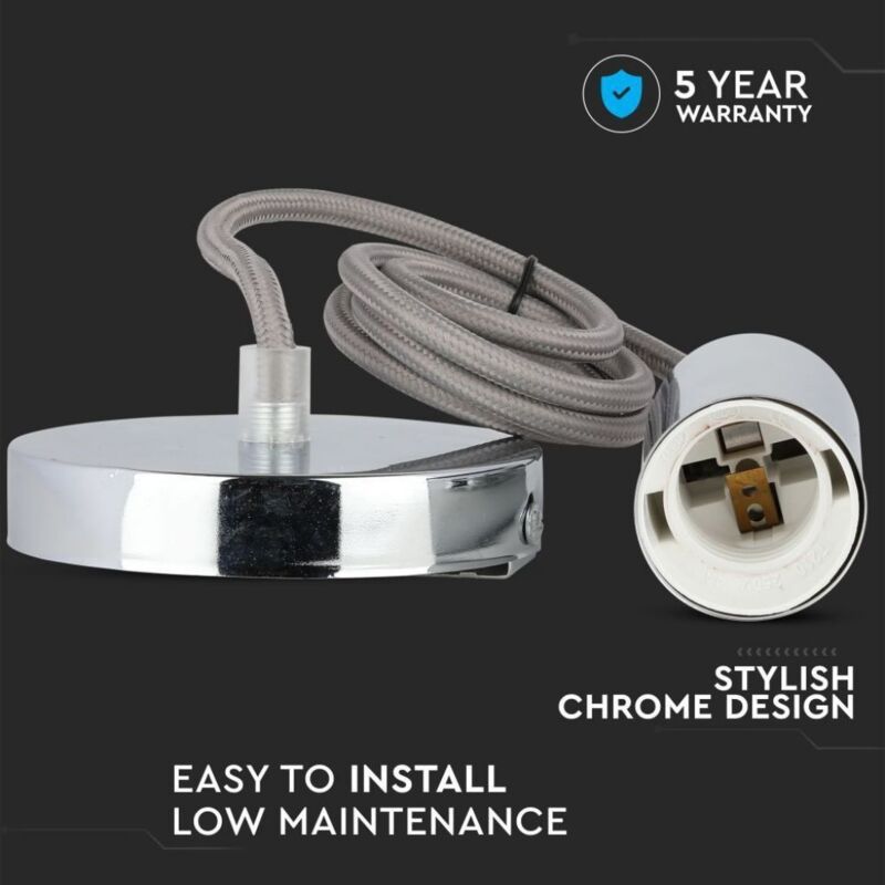 Lampadario con Portalampada Cromo Dome Grigio Chiaro Cavo SKU: 3786: VT: VT-7338 Caratteristiche del prodotto .Le lampade a sospensione serie cromata / placcata in ororosa sono disponibili con diverse colorazione dei cavi .Facili da montare .L attacco E27 con potenza massima di 60W .La tensione di alimentazione richiesta: 220/240 Volt Installazione .Adatte a molteplici impieghi: illuminazione residenziale, alberghi, ristoranti, uffici, ovunque sia necessario l impiego di lampade a sospensione. Specifiche tecniche: Informazione generale = ~:Tipo di attacco=E27~: Dati elettrici = ~:Potenza=Max. 60W~:Tensione di ingresso=AC 220-240V~:Frequenza=50Hz~:Fattore di potenza=50Hz~: Dettagli corpo = ~:Tipo=Lampadario con Portalampada~: Funzionalità = ~:Compatibilità=La lampadina E27 NON è compresa (occorre acquistarla a parte)~: Dimensione = ~:Dimensioni=Ø36 x 60 mm~: Dati del prodotto = ~:Numero d'ordine=3786~:Numero di prodotto=VT-7338~:Pezzi per confezione=1~:Codice
