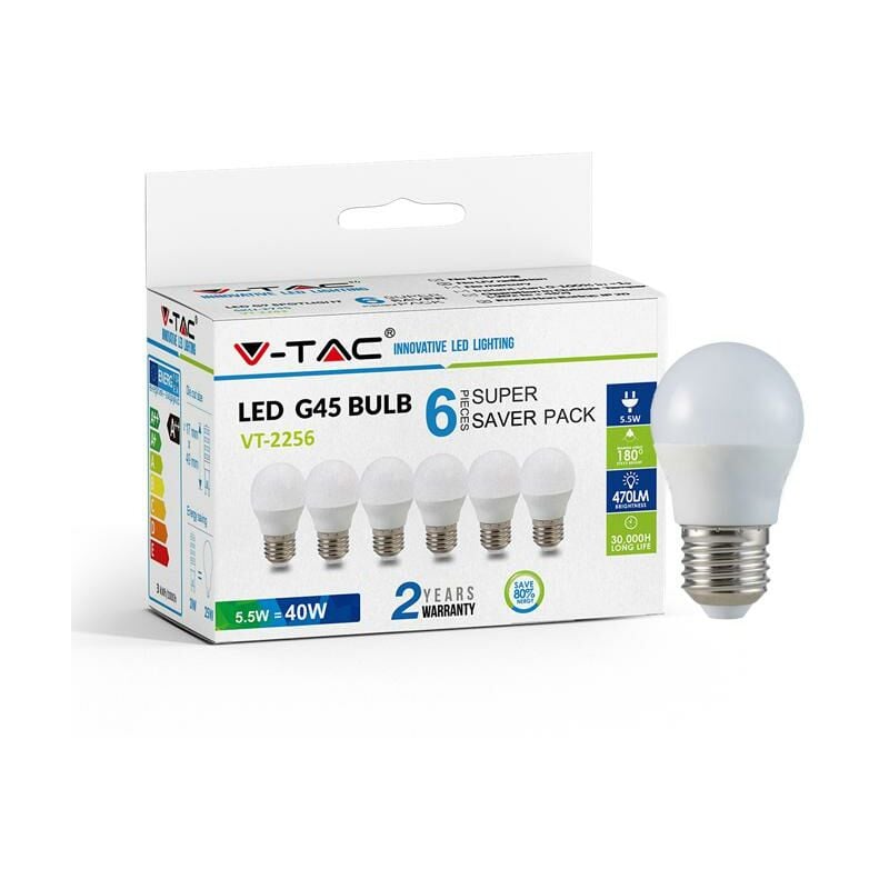 LED Lampadina 5.5W E27 G45 4000K 6PCS/PACK SKU: 2731: VT: VT-2256 Caratteristiche del prodotto .80% di consumo energetico in meno rispetto alle lampadine standard .Lunga durata .Nessuna emissione di radiazioni UV e radiazioni non ionizzanti .Accensione immediata, nessun tempo di riscaldamento .Bassa potenza termica .Direttamente sostituibile alle lampade ad incandescenza tradizionali Installazione .Aree Commerciali e Residenziali .Hotel, Bar .Stand espositivi .Lampadari .All aperto, esclusivamente all interno di apparecchi idonei. Specifiche tecniche ~: Informazione generale = ~:Attacco=E27~:Tipo Lampadina=G45~:Tipo LED=SMD~:Vitamedia=30000 ore~: Dati elettrici = ~:Potenza=5.5W~:Potenza EQV. a incandescenza=40W~:Tensione=AC: 220-240V~:Frequenza=50Hz~:Fattore di potenza=50Hz~: Dati tecnici luce = ~:Fascio Luminoso°=180°~:Colore della luce=Bianco naturale~:Temperatura di colore=4000K~:Flusso luminoso (lm)=470 lm~:Indice di resa cromatica Ra=>80~: Dettagli corpo