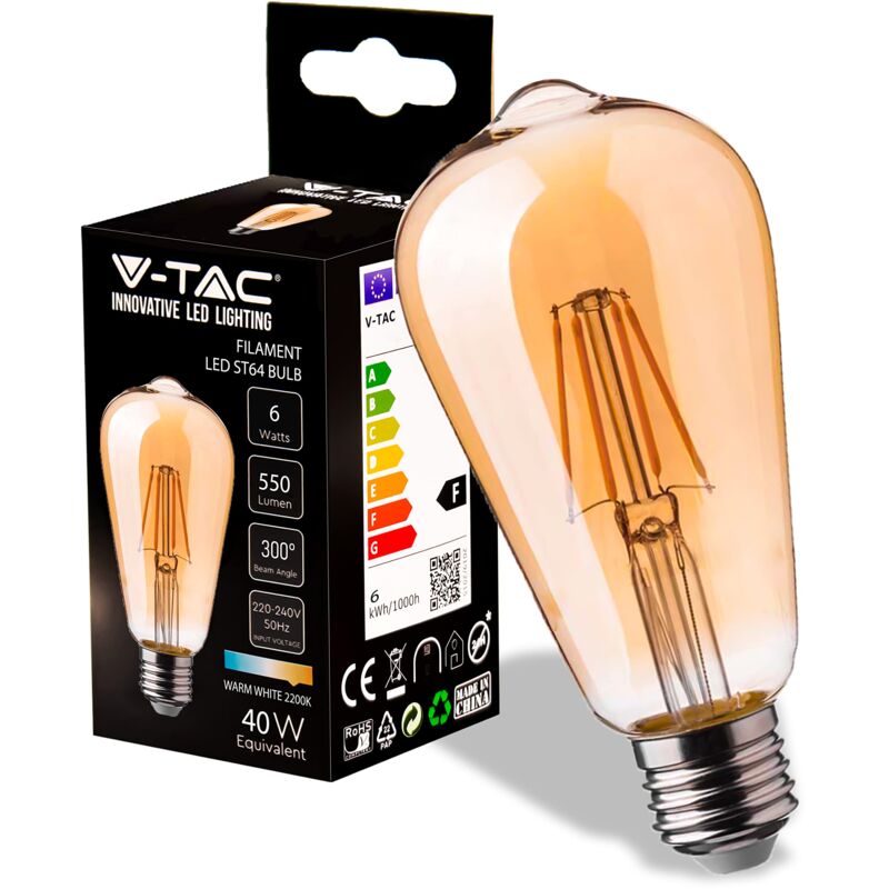 V-TAC Lampadina LED Filamento Ambrata ST64 con Attacco E27- 8W (Equivalenti a 50W) - 720 Lumen - Lampadine Vintage - Massima Efficienza e Risparmio Energetico - 2200K Bianca Calda