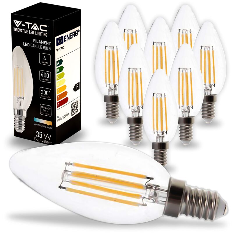 V-TAC 10x Lampadine LED Filamento Candela con Attacco E14 - 4W (Equivalenti a 35W) - 400 Lumen - Lampadina LED Massima Efficienza e Risparmio Energetico - 3000K Luce Bianca Calda