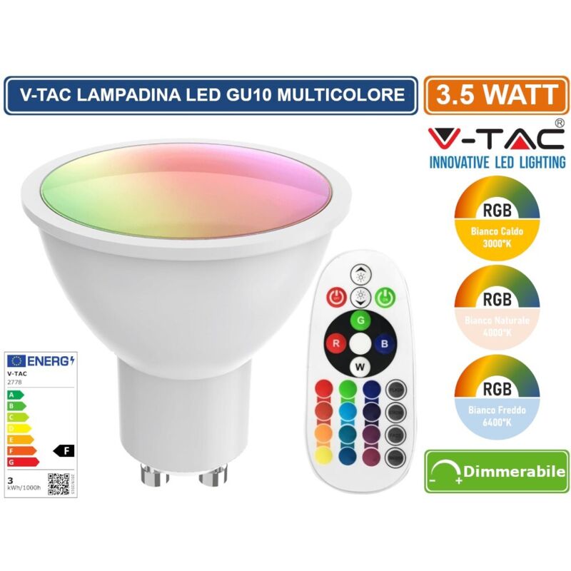 V-TAC VT-2244 Faretto LED GU10 3,5W Satinato con Telecomando RGB + 6400K - SKU 2780 Caratteristiche del prodotto 80% di consumo energetico in meno rispetto alle lampadine standard Lunga durata Nessuna emissione di radiazioni UV e radiazioni non ionizzanti Accensione immediata, nessun tempo di riscaldamento Bassa potenza termica Direttamente sostituibile alle lampade ad incandescenza tradizionali Installazione Aree Commerciali e Residenziali;