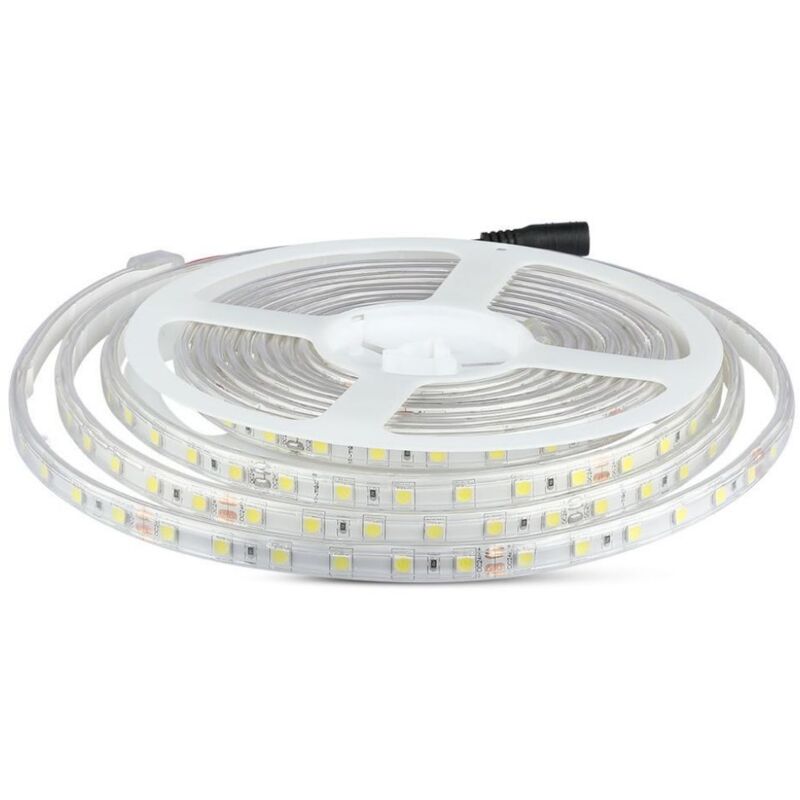 Striscia flessibile LED in gomma con retro biadesivo ad alta resistenza. La striscia misura 5 metri ed una larghezza di 11.4mm ed composta da 60 LED per metro. Questa striscia LED ha una potenza di 9W al metro ed un rapporto di 92lm/W, con una potenza totale in flusso luminoso ad alta luminosit di 41500LM. La striscia LED pu essere collegata direttamente all'impianto elettrico, mediante l'utilizzo di un alimentatore switching o tradizionale a spina da 24V DC (non incluso nella confezione). Protezione Waterproof IP65 che consente di installare la striscia LED sia in ambienti interni (locali, case, magazzini ecc..) che esterni (giardini, cortili, terrazze ecc..). Possibilit di tagliare la striscia a vostro piacimento ogni sei led (5cm). Prodotto fornito di fascette in gomma trasparete per il fissaggio a parete. Tecnologia LED: SMD-5050 Numero chip LED: 60 LED al metro Lunghezza bobina: 5 metri Totale Led: 300 LED Alimentazione: DC 24V Colore della luce: Bianco freddo (6400K) Potenza: ~