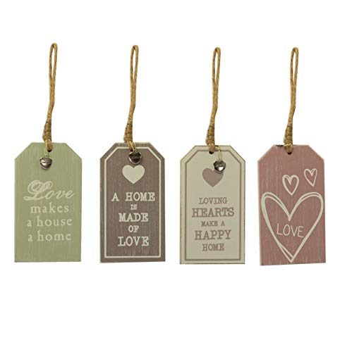 Il set comprende 4 pezzi: 1)Targhetta bianca con scritta in inglese: "Loving Hearts make a happy home" e con piccolo cuoricino decorativo in metallo appeso. 2)Targhetta verde con scritta in inglese: "Love makes a house a home" e con piccolo cuoricino decorativo in metallo appeso. 3)Targhetta rosa con scritta: “Love” e con piccolo cuoricino decorativo in metallo appeso. 4)Targhetta marrone: con scritta in inglese: “A home is made of love” e con piccolo cuoricino decorativo in metallo appeso.