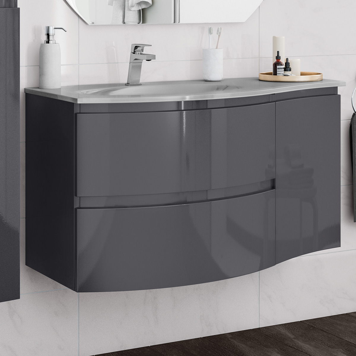 In PVC grigio antracite Lucido, 1 anta, chiusura rallentata. Organizer interno;