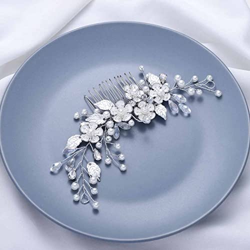 Vakkery - Pettinino da sposa, argentato, con motivo floreale e perline, accessorio per capelli da sposa, per donne e ragazze
