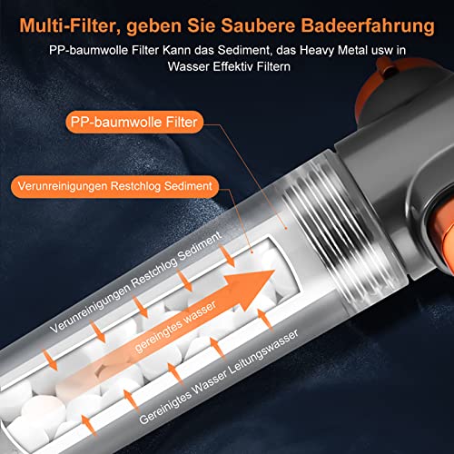 Soffione doccia con filtro: il contatto frequente con cloro e altri prodotti chimici presenti nell'acqua può causare pelle secca, irritata e capelli fragili e scoloriti. Ma con il nostro filtro in cotone PP per la declorazione garantisce un'esperienza di doccia senza cloro. In questo modo è possibile fare una doccia tranquillamente e rilassata, un approvvigionamento idrico equilibrato è garantito anche a basse pressioni dell'acqua