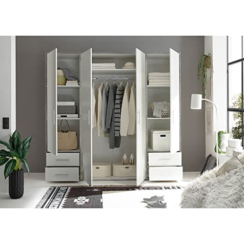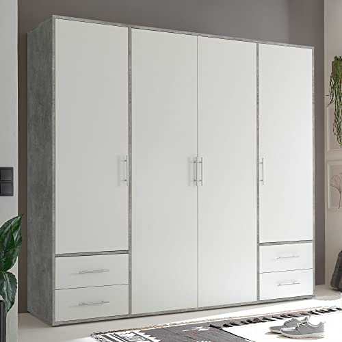 VALENCIA, Armadio effetto cemento, bianco, a 4 ante molto capiente, versatile con ante a battente, per la vostra camera da letto, 206 x 195 x 60 cm, L x A x P