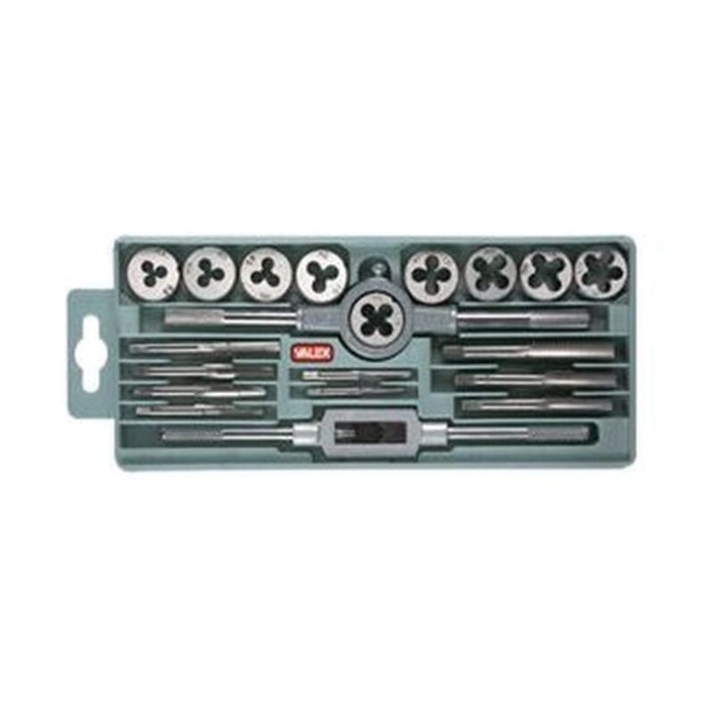 Valex Kit Set 20 Maschi e Filiere, Filiera Acciaio Inox per Filettatura, Cassetta MASCHI E FILIERE IN CASSETTA 20 PEZZI Il set comprende 9 maschi e filiere con filettatura metrica ISO a passo grosso, con misure che vanno da M3x0,50 a M12x1,75. Inoltre, è incluso 1 giramaschi e 1 portafiliere. Tutti gli strumenti sono realizzati in acciaio al cromo, il che li rende adatti per lavorare su metalli duri, compreso l'acciaio inox. Il set viene fornito in una pratica casetta di plastica.