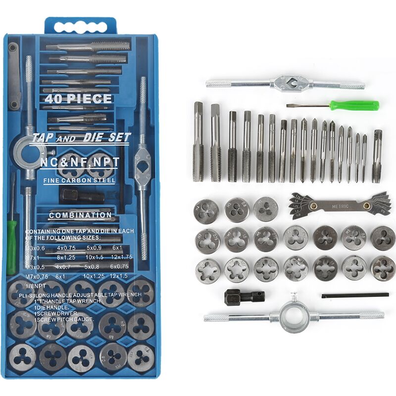 Descrizione del prodotto: Dimensioni: 40 pezzi Particolari: Inizia a scrivere facilmente, sia che si tratti di tagliare nuovo materiale o di cercare fili leggermente danneggiati, ad esempio. vecchie viti, candele, dadi e bulloni intaccati dalla ruggine. Le impugnature della chiave tengono saldamente il rubinetto e le parti. Le estremità svasate del rubinetto regolabile e le maniglie del rubinetto forniscono una presa antiscivolo per i lavori più difficili. La confezione include: 34 maschi e filiere metrici: M3 x 0,5 mm, M3 x 0,6 mm, M4 x 0,7 mm, M4 x 0,75 mm, M5 x 0,8 mm, M5 x 0,9 mm, M6 x 0,75 mm, M6 x 1,0 mm, M7 x 0,75 mm, M8 x 1,0 mm, M8 x 1,0 mm, M8 x 1,25 mm, M10 x 1,25 mm, M10 x 1,5 mm, M12 x 1,5 mm, M12 x 1,75 mm, 1/8"" NPT-27 1 x chiave inglese regolabile (1/8 "NPT-27) 1 chiave con impugnatura a T 1 maniglia per dado 1x cacciavite 1 calibro di filo 1 custodia.