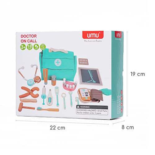 UMU® Valigetta Dottore in Legno per Bambini con Stetoscopio, Sfigmomanometro, Accessori Dentista ecc., Kit Dottoressa per Gioco d'Imitazione, 18 PZ Set Medico per Bambino e Bambina da 3 4 5 Anni