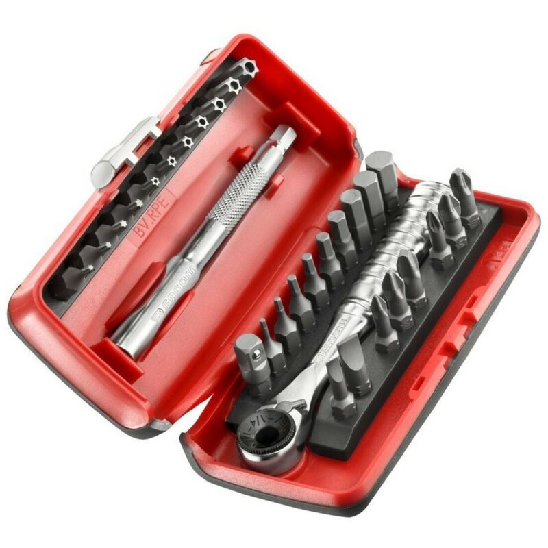 Contiene: - 1 x ultra-compatto 1/4 cricchetto: R.PE. - 1 x prolunga: L 100 mm (EF.RPE). - 28 x punte - unità 1/4 - 6,35 mm - L 25 mm: - EP.1T per viti a croce Phillips®: PH1 - PH2 - PH3. - ED.1T per viti Pozidriv® Phillips®: PZ1 - PZ2 - PZ3. - ES.1T per viti con intaglio: 4 - 5,5 mm. - EH.1 per viti con esagono incassato metrico: 1,5 - 2 - 2,5 - 3 - 4 - 5 - 6 - 7 - 8 mm. - EX.1 per viti Torx®: T6 - T7 - T8 - T9. - EXR.1 per viti Resistorx®: TT10 - TT15 - TT20 - TT25 - TT27 - TT30 - TT40. - 1 portabit: ECR.1. - Valigetta vuota in due materiali: BV.RPE1.