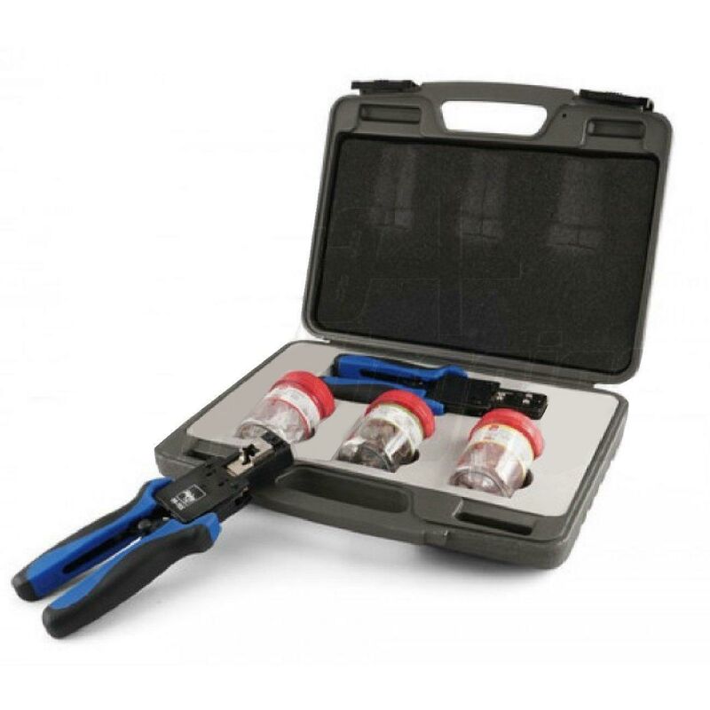 VALIGETTA PINZA 98-155 E CONNETTORI Kit valigetta per crimpatura connettori RJ45 passanti. La pratica valigetta contiene tutto il necessario per semplificare la crimpatura dei connettori RJ45 per reti LAN. Contenuto confezione 98-155: pinza RJ45 94-914/5B: vasetto 25pz RJ45 Cat.5e UTP 94-914/6B: vasetto 25pz RJ45 Cat.6 UTP 94-916/6B: vasetto 25pz RJ45 Cat.6 FTP