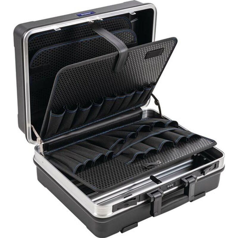 Valigetta PROMAT (L500xP225xH430mm / 34,3 l plastica ABS) - 4000871664 codice articolo:120.03/PPROMAT EAN:4015448785552 Peso della Spedizione:5,27 kg Gusci in materiale ABS altamente resistente agli urti Robusto telaio in alluminio con bordo paraurti la protezione protegge l'utensile e la valigetta · nero · 2 serrature ribaltabili e una serratura a combinazione garantiscono la massima sicurezza · 4 piedini aggiuntivi garantiscono una particolare stabilità · massimo comfort grazie alla maniglia rimovibile · il guscio della base può essere diviso in modo variabile tramite divisori in alluminio · scomparto portadocumenti aggiuntivo in formato A4 · con copricerniera e supporto per coperchio di sicurezza Dimensioni interne: (L x P x A) 470 x 200 x 365 mm · Caratteristiche: pannello portautensili rimovibile nel coperchio con 22 tasche portautensili sul davanti e sul retro, piastra di copertura rimovibile per il vassoio base con 15 tasche portautensili