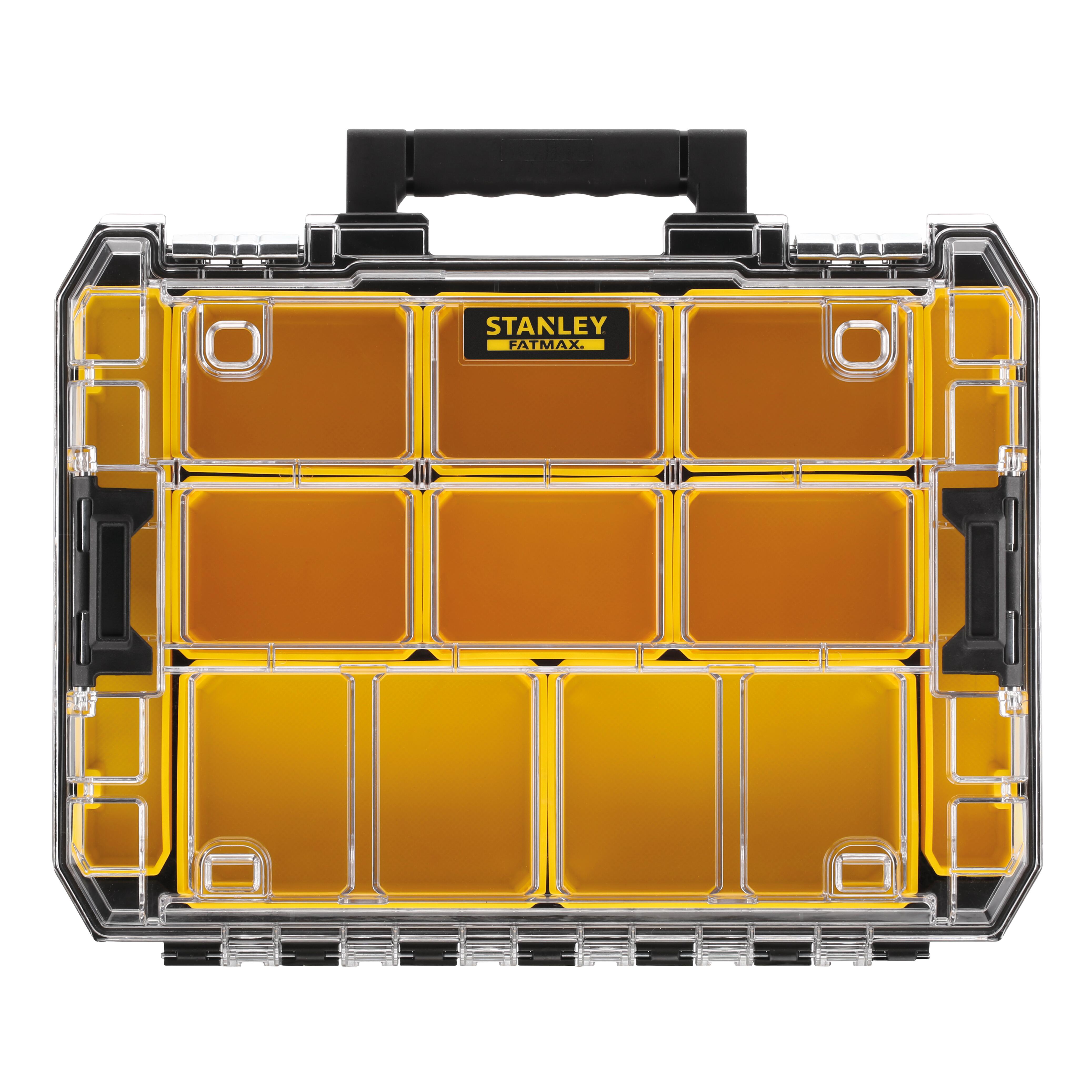 Organizer porta minuteria PRO-STACK FATMAX. Prodotto modulare, agganciabile e sovrapponibile, incrementata capacità ed efficienza dello spazio interno.. Combinazione di vaschette asportabili di varie misure per minuteria. Accessori ed utensili: 6 vaschette grandi, 2 doppie e 2 strette. Capacità 7,8 litri, Asola per chiusura con lucchetto.Cerniere di chiusura in metallo uso intenso. Cerniere laterali per sovrapporre più unità.