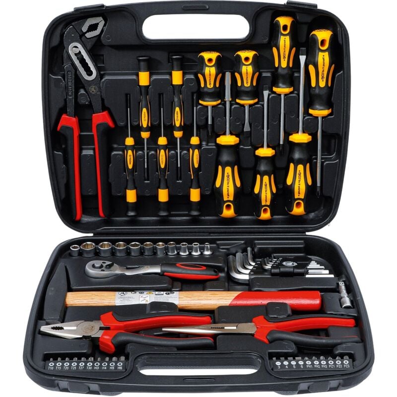 Oggetto della fornitura: Pinza a pappagallo, 245 mm Pinza combinata, 180 mm Pinza becchi mezzi tondi, 200 mm Martello da carpentiere, 300 g Serie di bussole, azionamento 6,3 mm (1/4) Cricchetto reversibile, dentato fine, 72 denti Prolunga, Quadro interno/esterno 6,3 mm (1/4) 50 mm Adattatore per inserti 6,3 mm (1/4) esagono interno 6,3 mm (1/4) Inserti per bussole, cromate opache 4 - 6 - 7 - 8 - 9 - 10 - 11 - 12 - 13 mm Inserti, esagono esterno 6,3 mm (1/4) Inserti, Intaglio piatto 3 - 4 - 5 - 6 mm Inserti, Intaglio a croce PH1 - PH2 - PH3 Inserti, Intaglio a croce PZ1 - PZ2 - PZ3 Inserti, Profilo a T (per Torx) T10 - T15 - T20 - T25 - T27 - T30 Inserti, esagono interno 3 - 4 - 5 - 6 mm Cacciavite Cacciavite con intaglio piatto 0,4 x 2,0 x 50 mm - 0,4 x 2,5 x 50 mm - 0,5 x 3,0 x 50 mm - 1,0 x 5,5 x 75 mm - 1,2 x 6,5 x 38 mm - 1,2 x 6,5 x 100 mm Cacciavite a croce PH00 x 50 mm - PH0 x 50 mm - PH1 x 75 mm - PH2 x 38 mm - PH2 x 100 mm Portainserti esagono interno 6,3 mm (1/4), 75 mm