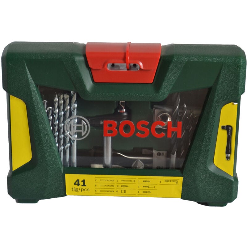 Set 41 pezzi foratura e avvitatura: Cacciavite a squadra - 7 Punte metallo HSS - 6 Punte per muro - 5 Punte Legno - 2 Punte fresatrici piatte - 11 bit avvitamento - 6 bussole - Svasatore conico e portabit magnetico - 1 adattatore per bussole