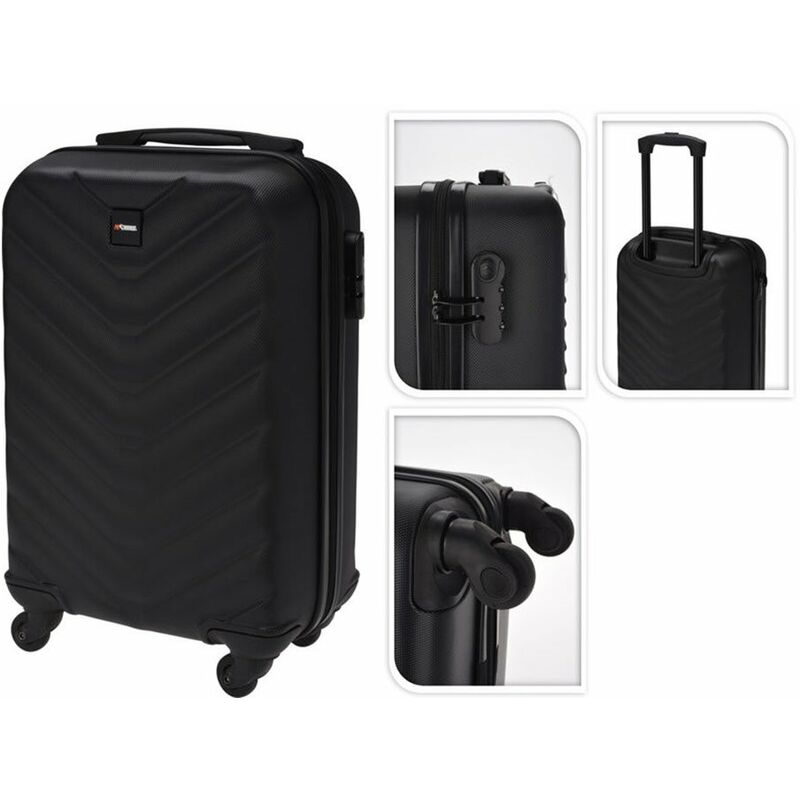Valigia da cabina con ruote nere 28l. Dimensioni: 33x20x53cm (larghezza/profondità/altezza) con 4 ruote piroettanti, chiusura laterale a combinazione, tubo in alluminio con manico in pp. Interno foderato nero con tasca con zip e fascia elastica. Colore: Nero Caratteristiche: Con ruote girevoli a 360° Caratteristiche: Chiusura di sicurezza con chiave numerica Capacità: 28l Misure: 33x20x53cm Caratteristiche: Con tasca con cerniera e fascia elastica Materiale: tubo di alluminio con manico in polipropilene EAN: 8720573231206 Produttore: PR WORLD Peso (kg): 2,25 Riferimento: 90496