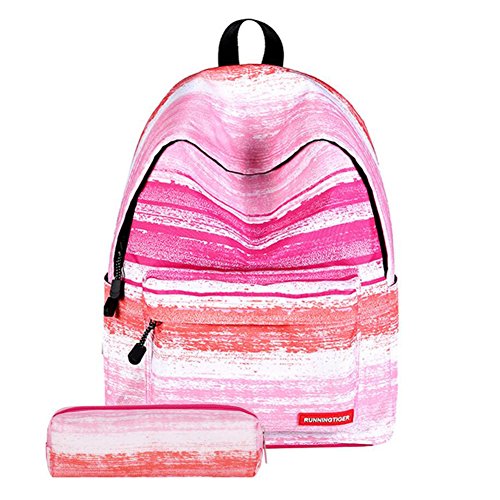 Valleycomfy Borse da studio dello zaino dello zaino della tela di canapa dello studente del centro della scuola Zaino casuale di stampa 3D con la cassa della matita, stripe rosa