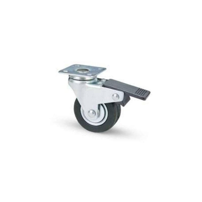 RUOTA IN GOMMA PIASTRA GIREVOLE CON FRENO mm.60 Supporto in acciaio stampato rotante su doppia corona di sfere con dispositivo di bloccaggio ruota.Esecuzione: zincocromato e ottonato.Ruota in gomma nera o grigia.L'impiego è consigliato per mobili per ufficio, espositori, mobili metallici etc. Viti Suggerite: M 8-10 x 15-30Altezza: 56 mmAttrito Statico: 300 NAttrito Dinamico: 200 N