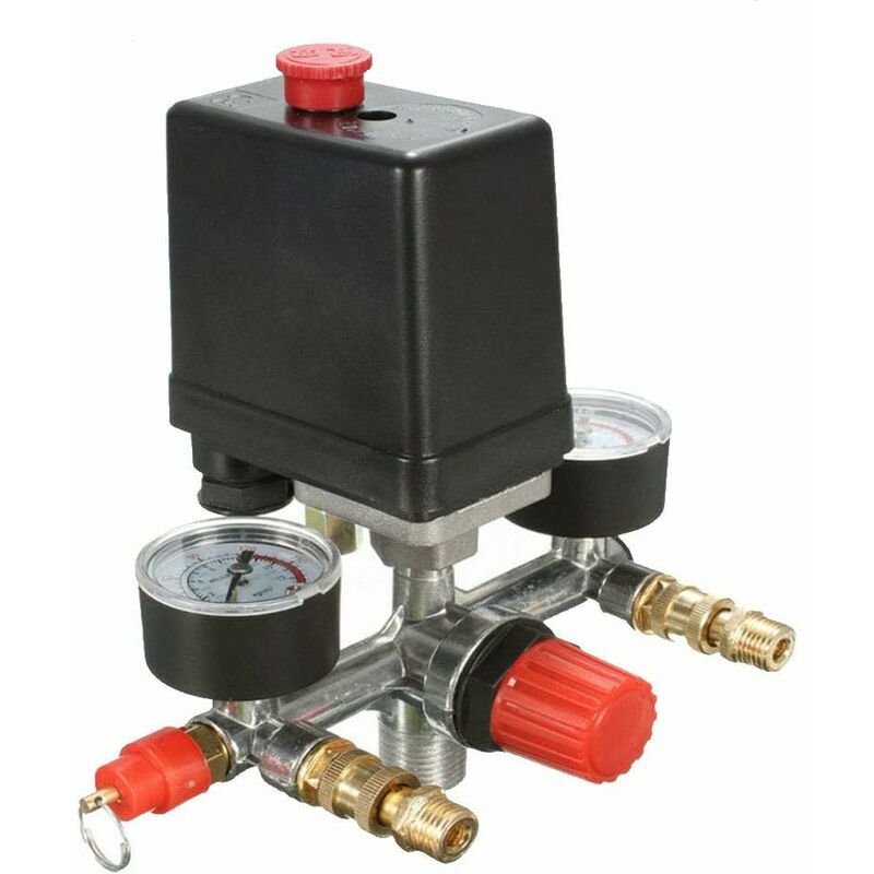 Gruppo interruttore valvola pressione compressore d'aria per compressore d'aria. Con pulsante rosso on/off, facile da usare. Controllo automatico, funzione di carico/scarico automatico. Ha la manopola della valvola, può regolare la pressione dell'aria secondo necessità. Dotato di 2 manometri a valvola, facile da ottenere il valore della pressione. Può aiutare a risparmiare l'energia elettrica del compressore d'aria. Facile da installare e comodo da usare.