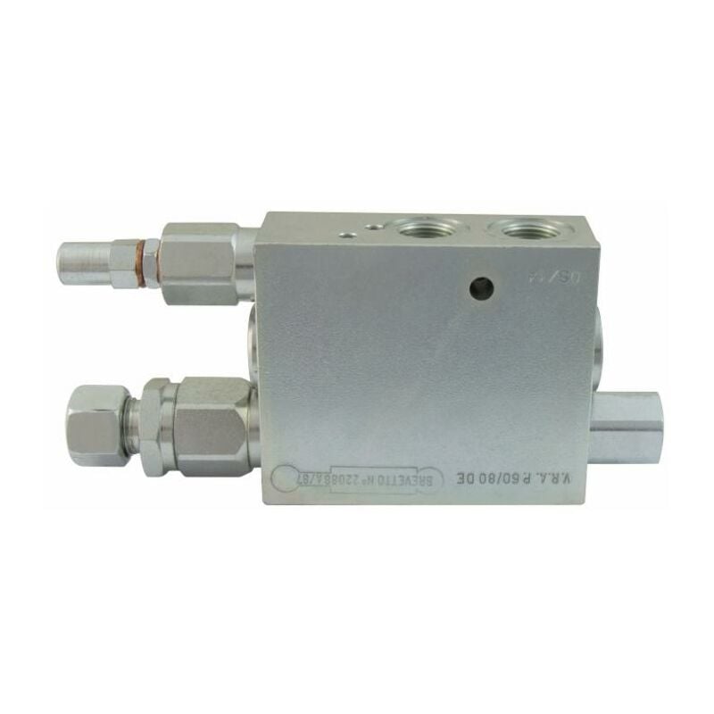 Valvola ribaltamento aratro a doppio effetto per alesaggio da 80 a 100 mm. Impiego: valvola realizzata per l'impiego su cilindri per aratri reversibili, in modo da ottenere l'inversione automatica del flusso d'olio e quindi del moto del cilindro idraulico atto a portare in rotazione l'aratro. È dotata di una valvola di blocco a doppio effetto che fornisce una maggiore sicurezza e dà la possibilità di posizionare e bloccare il cilindro in qualsiasi punto. L'inversione di marcia dell'asta del pistone si effettua tramite una valvola di massima pressione compensata esattamente nel punto morto dell'aratro, sviluppando maggiore potenza e velocità. Questa valvola può essere montata anche su aratri pesanti e sbilanciati. Dati principali Marca: Ama Refluid Modello: 80/100 Tipo: valvola ribaltamento doppio effetto Informazioni d'uso Settori di applicazione: agricoltura Misure Filettatura femmina: 3/8 Quota A: 58 Quota B: 94 Quota C: 176 Quota D: 35 Quota E: 80 Quota F: ø12