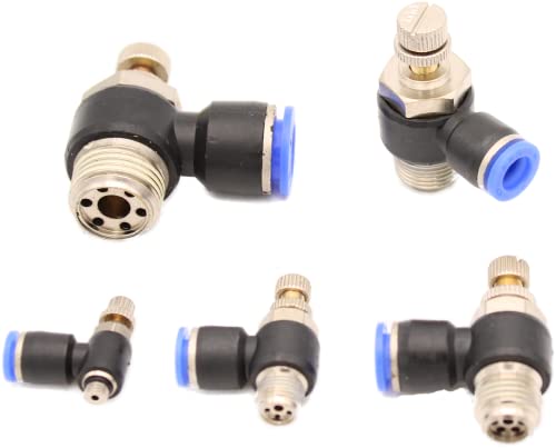 Valvola di scarico pneumatica con filettatura M5 o G 1/8", 1/2" e 4 mm, 6 mm, 8 mm, 10 mm o 12 mm per pneumatici. Tubo flessibile. Vantaggio di una limitazione di scarico: grazie all'aria libera di ingresso e all'aria di scarico ridotta, il comportamento del cilindro viene migliorato e porta ad una velocità costante anche sotto carico.