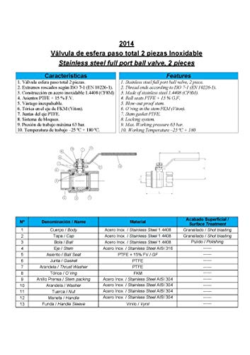 Valvola a sfera a passaggio pieno in acciaio inox con filettatura interna ad entrambe le estremità, set con maniglia a leva