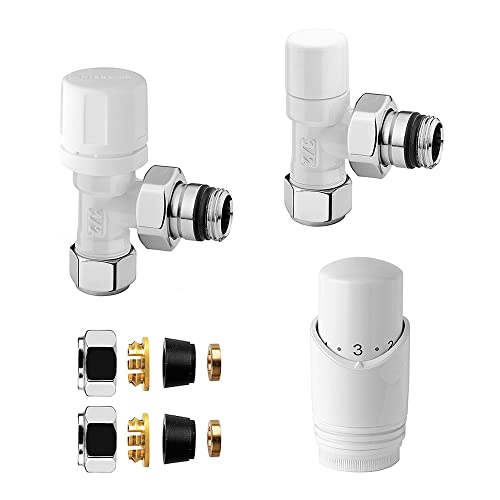 Valvola termostatica e detentore ½ in acciaio dalle diverse colorazioni, COMPLETI di termostato con sensore a liquido e raccordi per rame o multistrato (Rame 14, Bianco)