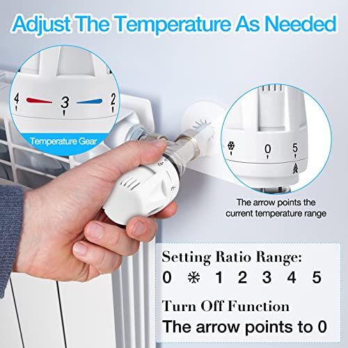 【Funzione antigelo】 La valvola termostatica del radiatore è adatta per radiatori compatti con blocco valvole integrato. La valvola termostatica del radiatore non ha una regolazione fissa della temperatura, influenzata dalla temperatura di riscaldamento e dalla temperatura ambiente, può rilevare le variazioni della temperatura esterna. Grazie alla protezione antigelo integrata, questa testa termostatica può essere utilizzata anche in zone fredde e impedisce il congelamento del radiatore.