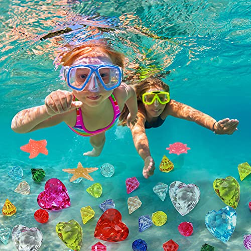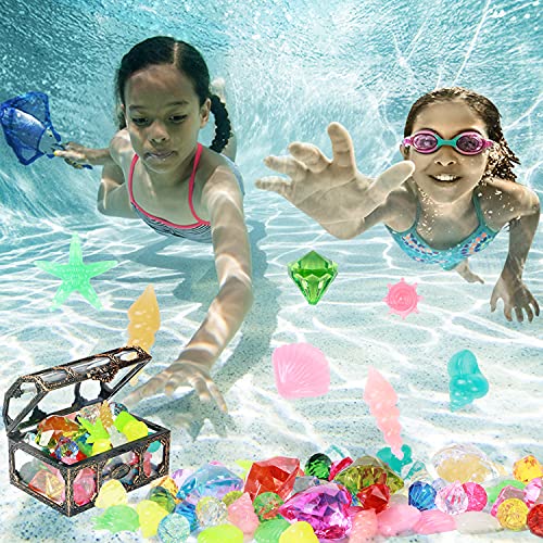 Set di giocattoli subacquei: confezione da 54 pezzi, tra cui 5 grandi gemme a forma di cuore, 29 gemme di diamanti piccole e 20 gemme luminose di plastica a forma di animale. I colori e le forme sono casuali per tutte le gemme subacquee. Inoltre, sono tutti imballati in una scatola del tesoro dei pirati che può essere affondata.