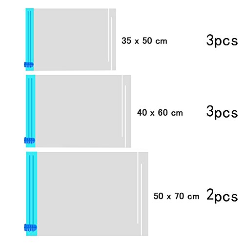 RIUTILIZZABILI: le nostre borse salva spazio sono realizzate in PA + PE e sono sottili ed ultraleggere, ma offrono comunque estrema resistenza e durata. Queste borse durano diversi anni e possono essere riutilizzate più volte.Borse da viaggio ideali per mettere sottovuoto vestiti, asciugamani, cuscini, lenzuola e federe, proteggerle da umidità / acqua o odori, sporco, insetti, tarme, ecc.