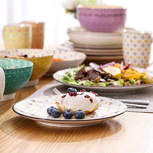 Collezioni complete. Servizio da tavola combinato da 40 pezzi composto da 8 tazze da caffè da 300 ml, 8 ciotole per cereali da 420 ml, 8 piatti fondi, 8 piatti da dessert e 8 piatti piani, perfetto per 8 persone. Ogni servizio da tavola contiene quattro diversi colori e motivi. Super sicuro e ben imballato.