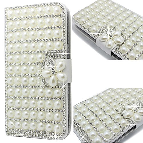 Vandot Accessori 3D strass Pearl Pelle PU Leather di Cuoio Sintetico Silicone Telefono Caso Custodia Per Samsung Galaxy J5 Bling Caso della Copertura della Cassa del Diamante di Scintillio della Case Cover Libro Raccoglitore della Prottetiva pelle di Caso di Shell del Telefono - Fiore Bianco