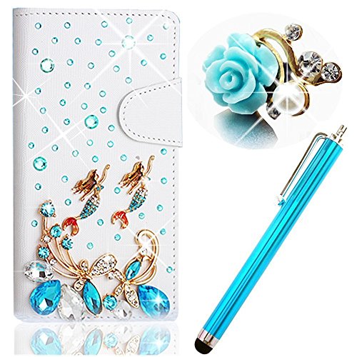 Vandot 3 in1 Accessories Set Elegante Lusso Sottile Flip Folio Pelle Leather Case per Samsung Galaxy A5 Classico Protector Protettiva Custodia Cover Rhinestones Diamond Glitter Shinning Shell Bling Book Magnete Snap-on Supporto Copertura Caso Blu Mermaid Sirena Fiore Stile + Cristallo Strass Flower Modello Protezione di Polvere Anti-Dust Polvere Spina Blue + Azzurro Penne Capacitive Universali Stylus Penna per Dispositivi Touchscreen