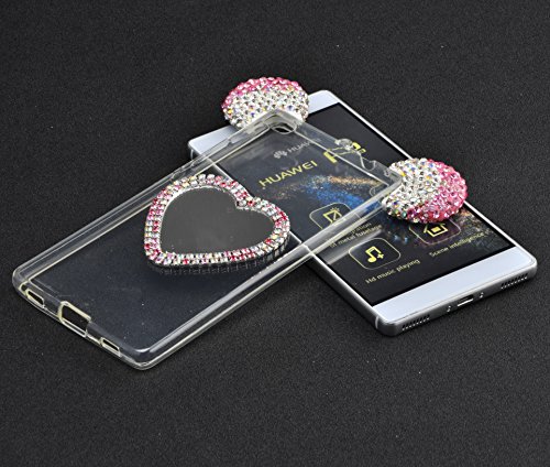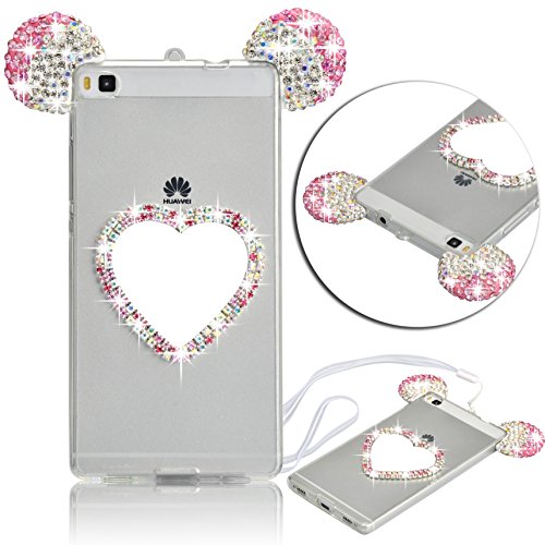 Vandot Huawei P8 Cover 3D Lovely Custodia in Silicone Glitter Bling Diamante Strass Orecchie di Topolino Mouse Ear con A forma di Cuore Trucco Specchio Case Anti-urto Slim Trasparente Soft Morbido TPU Bumper Copertura della Protezione con White Lanyard per Huawei P8 - Pink Rosa