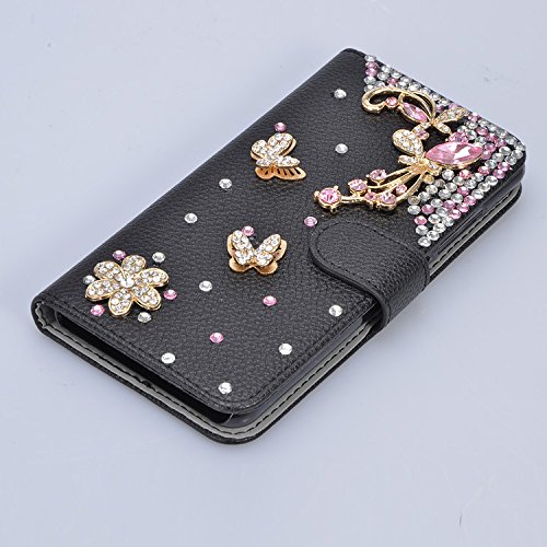 Vandot 3 in1 Set Lusso Classico Nero Attraente Ultra Sottile Flip Folio per Microsoft Lumia 535 Nokia N535 PU Pelle Leather Case di Silicone Housing Shell 3D Rosa Pearl Farfalla DIY Protector Custodia Cover Magnete Snap-on Stile - Rosa Farfalla + Cristallo Strass Fairy Angelo Girl Anti-Dust Spina con Metallo Rosa Screen Touch Stylus Stilo