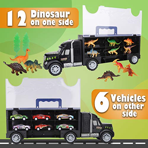 【Dinosaur Truck Set】 37PCS include 1 grande camion, 6 mini auto da corsa, 1 dinosauro, 12 piccoli dinosauri, 6 uova di dinosauro, 10 segnali stradali e 1 mappa.