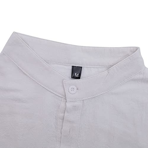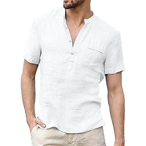 VANVENE Mens moda cotone lino Henley camicie casual spiaggia estate tinta unita top con tasca, bianco, M