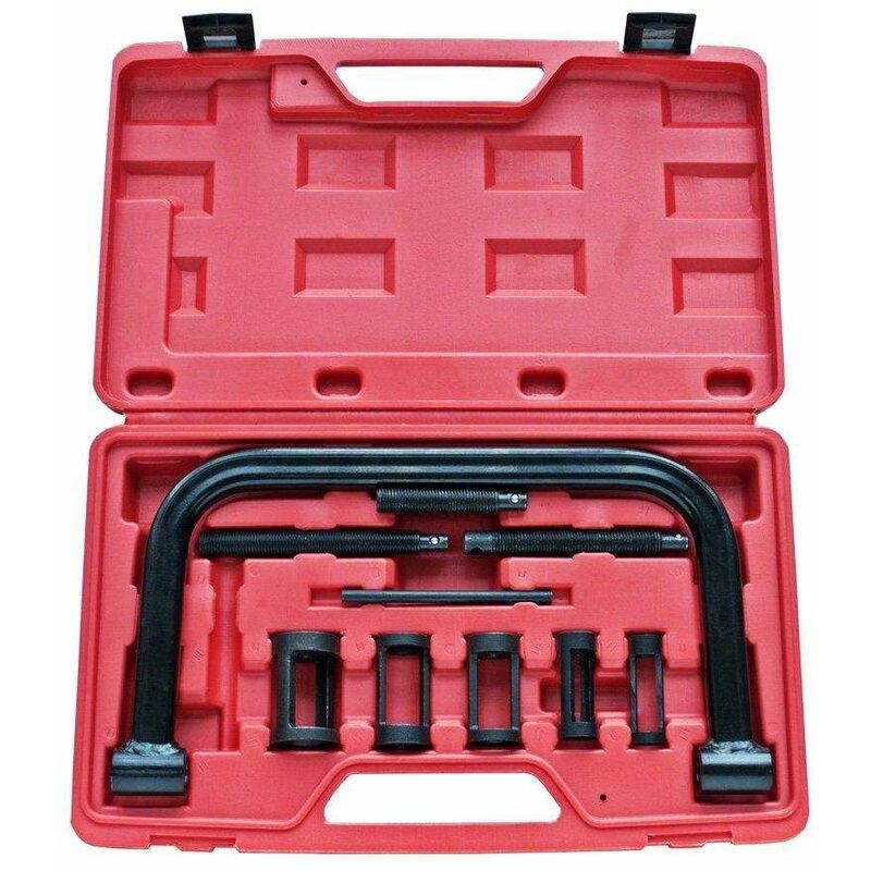 MORSETTI VALVOLE UNIVERSALI COMPRESSORE A MOLLA SET RIPARAZIONE DA 10 PEZZI Questo kit permette lo smantellamento facile e sicuro delle valvole sui motori più piccoli. Il set include 5 adattatori: 16mm, 19mm, 23mm, 25mm e 30mm e 3 ulteriori spine cilindriche: 70, 110 and 120mm di lunghezza con un diametro di 12 mm. Scheda tecnica: Peso: 1,4 kg Colore: nero Ampiezza morsa: ± 17cm Dimensioni: 33,5x19x5cm Il set comprende: 1 scatola 5 adattatori 3 set di morse 1 archetto 1 barra