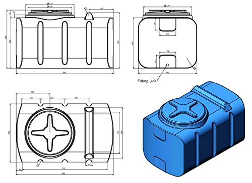Caratteristiche - Colore: blu | Lunghezza: 88 cm larghezza: 53 cm altezza: 53 cm senza coperchio (55 cm con coperchio) | sportello di ispezione: Ø 35 cm | spessore parete: 3,5 mm | attacchi 1 x 3/4 pollici | Il serbatoio dell'acqua è previsto per un uso stazionario!