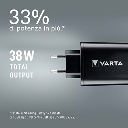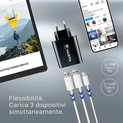 Varta - Caricatore da Parete con Cavo USB Tipo C, 3 Porte USB: 1 USB Tipo C 3.0A e 2 USB A 2.4A Shared
