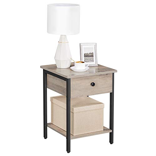 VASAGLE Comodino, Tavolo da Notte, Tavolino da Comodino, Punta del divano, Cassetto e Mensola, per Camera da letto, Soggiorno, Montaggio semplice, Telaio in Acciaio, Stile Industriale, Grecia e Nero