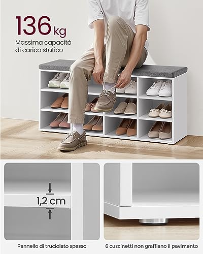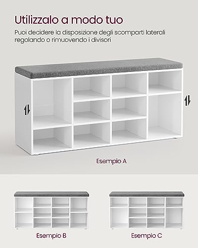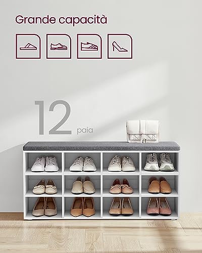 VASAGLE Panca Scarpiera, Scarpiera con Seduta, Scarpiera Ingresso con Cuscino e 12 Scomparti, Ripiani Regolabili, Corridoio Soggiorno, 30,3 x 104 x 48 cm, Bianco Classico LHS012W14