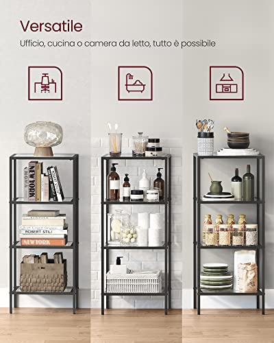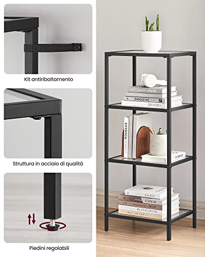 VASAGLE Scaffale in Vetro a 4 Ripiani, Liberia, Organizzatore Portaoggetti, Vetro Temperato, Facile da Montare, per Bagno Soggiorno Camera da Letto Studio, Nero LGT028B61